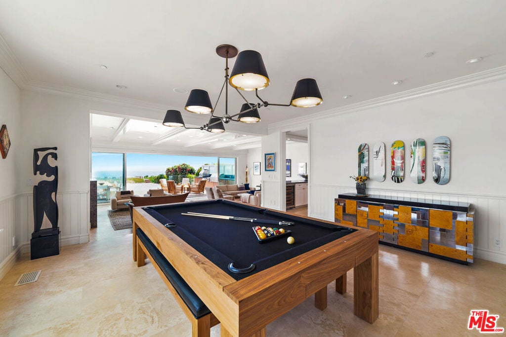 Available for the month of December! This dreamy Broad Beach oceanfront estate invites you to live and entertain indoors, outdoors, or both. Large rooms, vanishing walls, expansive decks, and even a private beach provide a stunning panorama of ocean and islands. The open layout offers spectacular sightlines and an ideal atmosphere for sophisticated entertaining and relaxed beachfront living. Every room is complete with gorgeous furnishings and fixtures, wonderful natural light, and beautiful detailing. The living room is huge, with high, plank-and-beam ceilings, fireplace, and stone floors, plus a wall of glass at one end that opens onto an enormous wood deck. Adjacent to the living room, the dining/billiards room features a remarkable convertible table for billiards, ping pong, and dining. The kitchen will inspire any chef, with its glorious views, generous built-ins, quality appliances, center island, bar seating, beverage cooler, and large pantry. Also on the main floor is a very comfortable home theater, a laundry room, and two en-suite bedrooms, one with four built-in bunks complete with lighting and ladders. Upstairs, there are more bedrooms, one currently used as a gym, plus the breathtaking primary suite. This serene retreat sits beneath high, sloped ceilings, and has a wall of glass opening onto a private ocean-view balcony. Dividing the room is a double-sided fireplace, with the sleeping area on one side and spacious sitting room on the other. This sublime space has dual walk-in closets and a lovely, spa-style bath. The home's impressive oceanfront backyard features an outdoor kitchen complete with barbecue and pizza oven, an enormous dining table, a sitting area, a lounge with firepit and built-in seating. Beyond the deck is a large private sandy beach, perfect for volleyball or parties, plus another sandy refuge with room for dining and relaxing, and a path across the riprap to the sandy expanse of Broad Beach. The outdoor area has built-in heat lamps and lighting, sprinklers, and an outdoor shower. In addition to numerous smart-home features, the home has a three-car garage with an extra refrigerator and freezer, plus guest parking for five cars. As a summer getaway or a year-round sanctuary, this Malibu residence is immaculate, inviting, and full of refined beauty. Pursuant to California AB 2202, any guest cleaning responsibilities and related charges are transparently outlined in the rental contract provided upon booking.