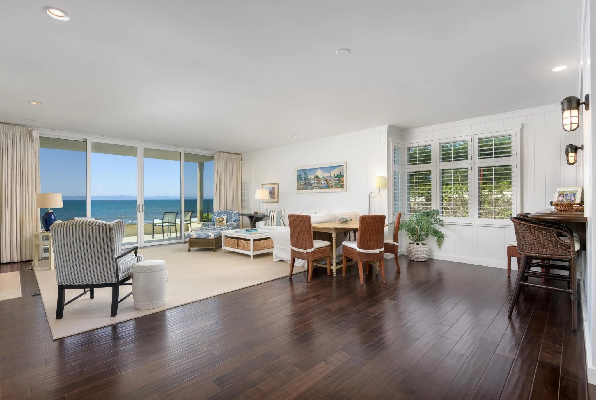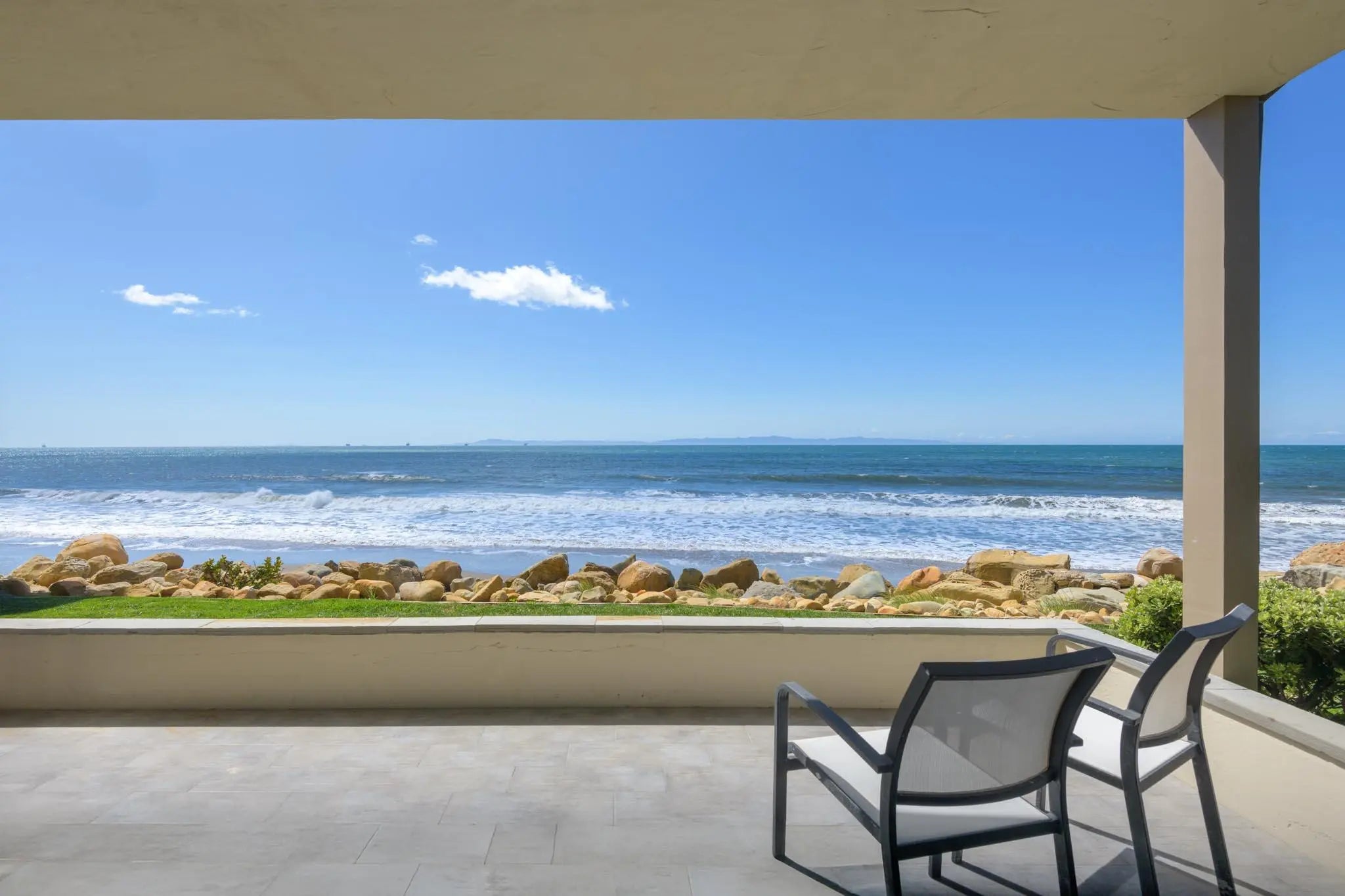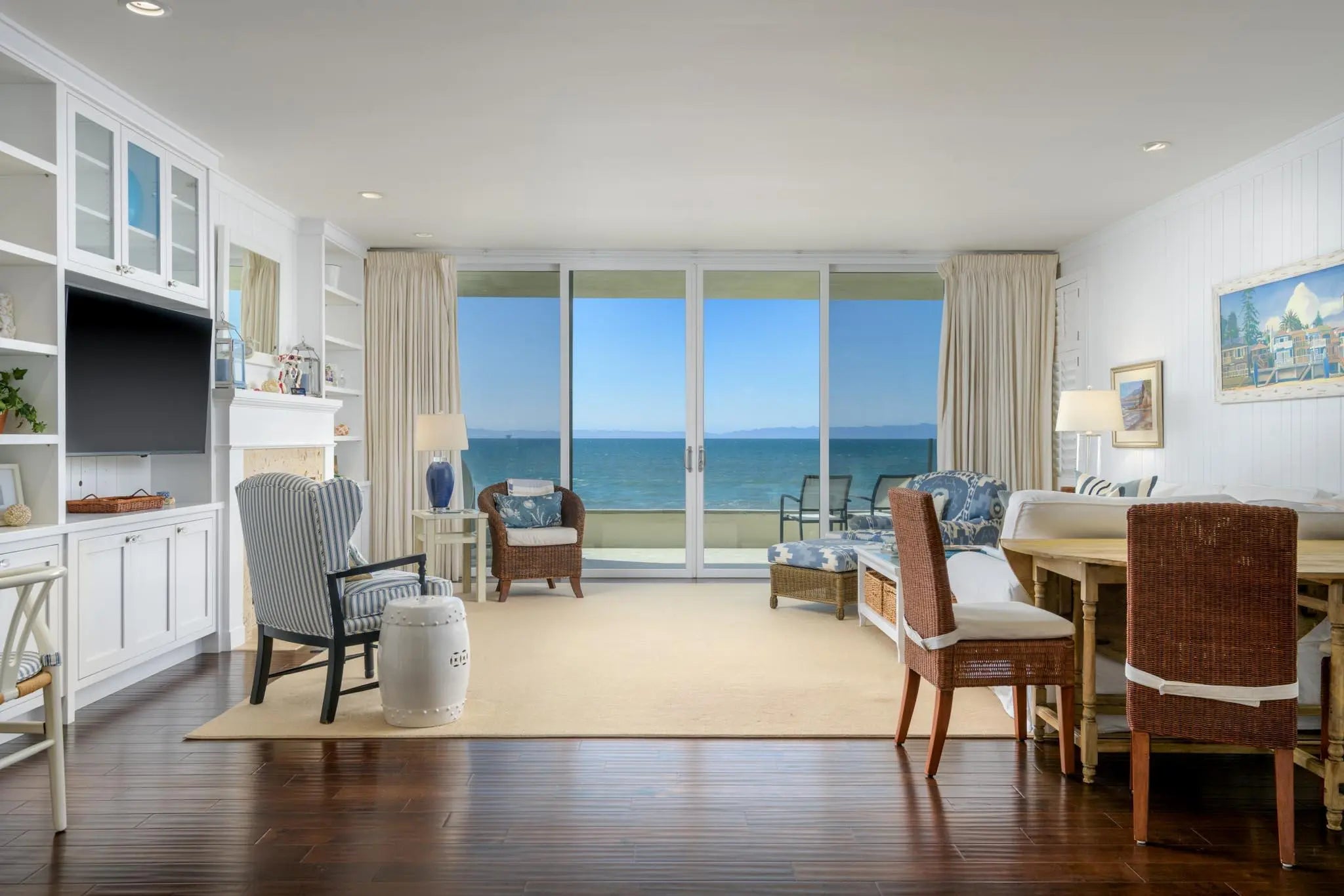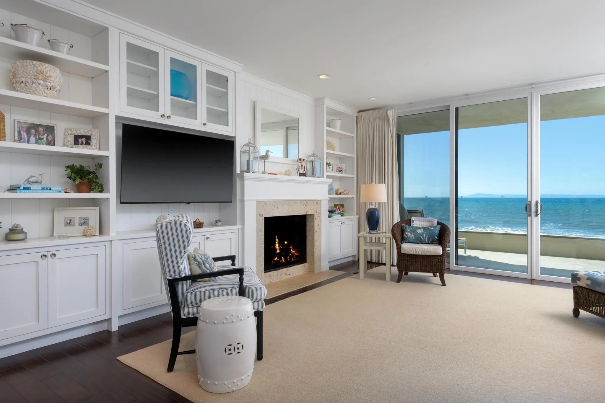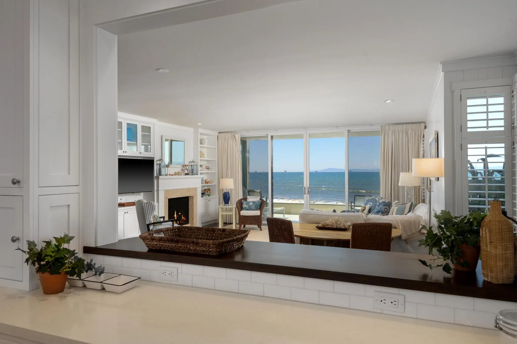 Welcome to one of the most sought-after oceanfront locations in Montecito—an exceptional ground-floor condo in the prestigious Bonnymede community. Perfectly positioned on the coveted southwest corner, this residence has walk-out access to the beach and sits directly adjacent to the iconic Coral Casino and offers uninterrupted views of the Pacific Ocean and Channel Islands. Step inside to an expansive open-concept layout, where the light-filled living room with a cozy fireplace seamlessly flows into a beautifully remodeled gourmet kitchen. Designed with both elegance and comfort in mind, the condo has been fully renovated in a timeless Cape Cod beach style by renowned designer Dick Meyn, combining relaxed coastal charm with refined finishes. Wake up to breathtaking ocean vistas from from the spacious primary bedroom and enjoy the soothing sounds of waves just steps away. The home features two bedrooms and two luxurious bathrooms, thoughtfully appointed to enhance the sense of peace and retreat. Additional highlights include a private two-car garage, exclusive access to the beach, and resort-style amenities such as a sparkling community pool and well-maintained tennis court. Whether you're looking for a full-time residence or a serene getaway, this once in a generation opportunity to acquire one of the most coveted locations in Bonnymede, offers the ultimate in beachfront living.