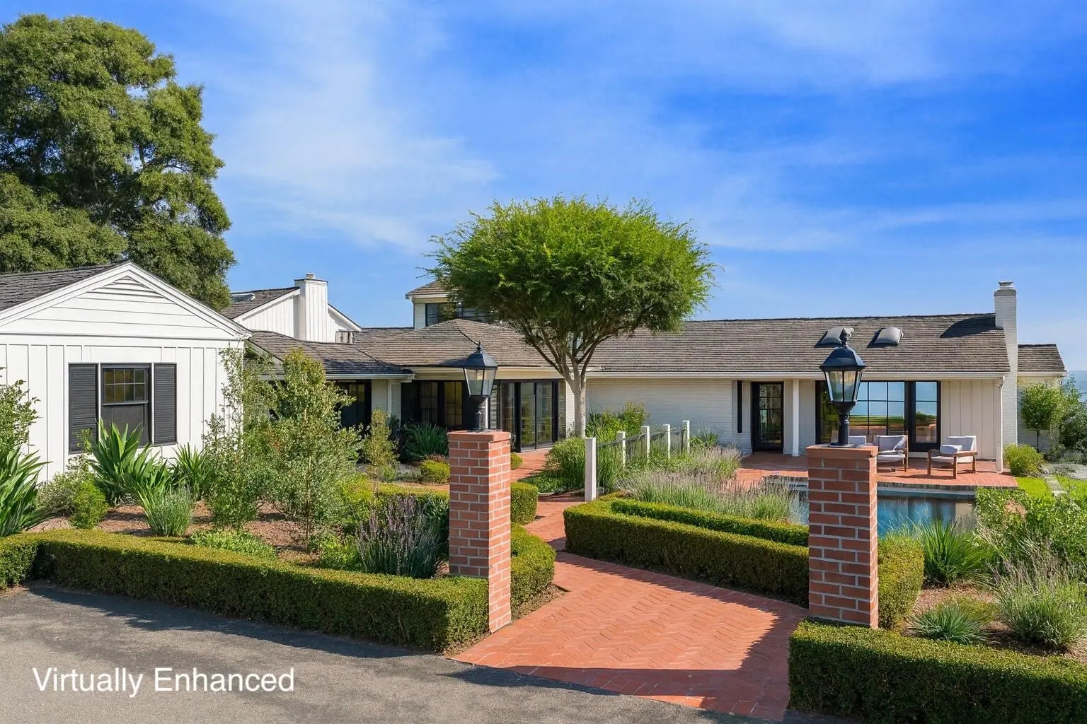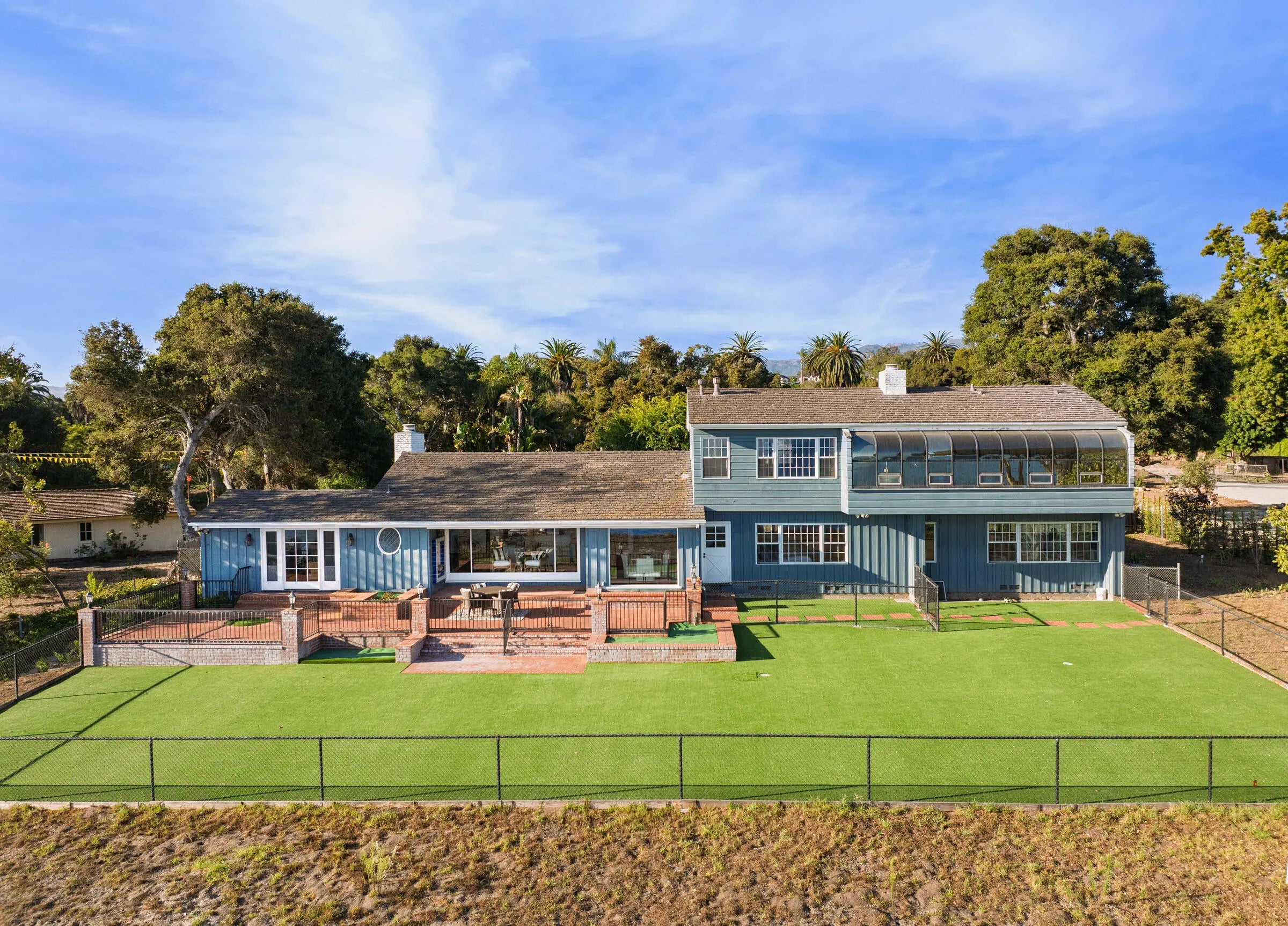 Poised above the Pacific on approximately ±2.5 acres of bluff-top land, this Hope Ranch estate captures the essence of coastal California living wide-open ocean views, privacy, and a lifestyle defined by natural beauty. A gated drive winds through groves of avocado and lemon trees, leading to the residence. Behind the home, sweeping lawns stretch toward the bluff's edge, where the horizon opens to uninterrupted views of the ocean and islands beyond. Inside, vaulted beamed ceilings, a stone fireplace, and walls of glass framing the sea create a dramatic focal point, while spacious interiors are filled with natural light and designed to maximize the views from every room. The dining room opens effortlessly to the backyard, the kitchen includes a bright breakfast nook, and the upstairs primary suite enjoys a private perch with commanding vistas. A separate 1-bedroom guest quarters with its own kitchen, living room, and private entrance offers both independence and comfort for extended stays. Outdoors, the property embraces coastal living with a pool and patio, expansive lawns, fruit trees, and breezy palms that set the stage for relaxation or entertaining. From greenhouse to pathways to bluff's edge, every element is in place for a lifestyle that is immediately enjoyable yet also holds opportunities for future vision. Here, in one of Santa Barbara's most coveted enclaves, residents enjoy a beautiful beach, miles of equestrian trails, tennis courts, and close proximity to La Cumbre Country Club & Golf Course. Rarely does a property combine such an extraordinary setting with a residence that is ready to enjoy today, with the option to shape its next chapter tomorrow.