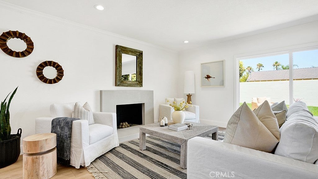 Welcome to 8411 Santana Circle, a beautifully reimagined designer home tucked away on a tranquil cul-de-sac in one of South Huntington Beach’s most desirable pockets of Huntington Crest. This 3-bedroom, 2-bathroom single-story stunner has been fully remodeled inside and out, delivering modern luxury with effortless coastal charm. From the moment you arrive, you'll notice the elevated curb appeal, with new front landscaping, a bold contemporary front door, with sleek black hardware, a new video doorbell, and upgraded exterior lighting that sets the tone for what’s inside. As you pass through the entry into an open, sun-drenched living space featuring white oak luxury vinyl plank flooring, custom wide baseboards, and LED recessed lighting throughout. At the heart of the home is a stunning plaster fireplace, offering a warm yet refined focal point. The chef’s kitchen is straight out of a design magazine, showcasing flat white oak cabinetry, quartz countertops, a designer tile backsplash, modern floating shelves, and a large eat-in island perfect for entertaining. Complete with a large kitchen sink, bespoke dishwasher, standing range, microwave, and garbage disposal, the space blends function and style seamlessly. The private primary suite offers a spa-like retreat, highlighted by a custom floating porcelain vanity, luxury tile shower, Starphire ultra-clear glass, and floating white oak shelving. The guest bath is equally curated with a soaking tub, statement tile work, and high-end finishes. Each bedroom features new closet doors, elegant matte black hardware, and designer lighting. Additional upgrades include a new roof, new dual-pane windows, sliding glass doors, a new AC unit with updated vent covers, garage door motor with keypad, new outlets, and custom wood fencing gates leading to a fully re-landscaped backyard — ready for summer evenings, kids, pets, or entertaining under the stars. Located minutes from award-winning schools, world-class beaches, and vibrant local hotspots, this home checks every box. Fully turn-key and move-in ready — the only thing missing is you.