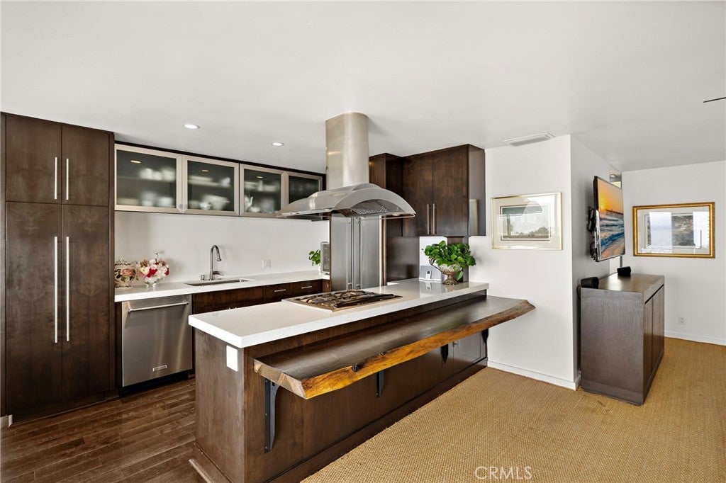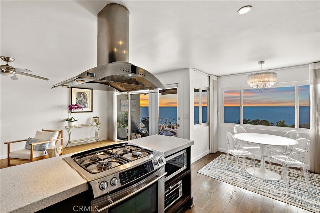 Perched above the famed Montage Resort in one of Laguna Beach’s most desirable coastal locales, this two bedroom, one bathroom condo offers stunning panoramic ocean views and a relaxed coastal lifestyle. From the kitchen, dining area, living room, and veranda, enjoy sweeping, unobstructed vistas of Catalina, Aliso Creek, and whitewater surf, along with vibrant sunsets and city light views that stretch up the coast toward Rancho Palos Verdes. Inside, the kitchen features frosted glass cabinetry, Caesarstone countertops, a custom Julian cedar dining bar, stainless steel appliances, and hardwood flooring. A cozy dining nook is positioned to make the most of the view, while the open concept living space brings in tons of natural light and creates a seamless flow for everyday living or entertaining. Glass sliders lead to a spacious veranda outfitted with remote-controlled shades, designed to filter sun without compromising the view. Central air conditioning adds comfort on warm summer days. The bathroom is thoughtfully designed with Italian cabinetry, Philippe Starck fixtures, dual vessel sinks, a walk-in glass shower, standalone soaking tub, heated towel rack, and two skylights for natural light. The primary bedroom includes a walk-in closet, while the second bedroom offers a mirrored closet and French doors that open to the living room and capture ocean views when open. Additional highlights include double-paned windows throughout, a private one-car garage, fresh interior paint, and access to a year-round heated community pool. This home offers the perfect opportunity for a full time residence, second home, or investment in one of Southern California's most sought after communities, just moments from renowned beaches, galleries, restaurants, hiking trails, and more!