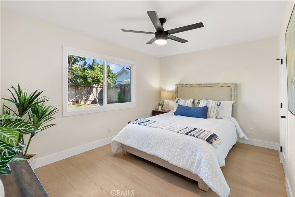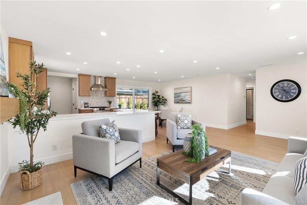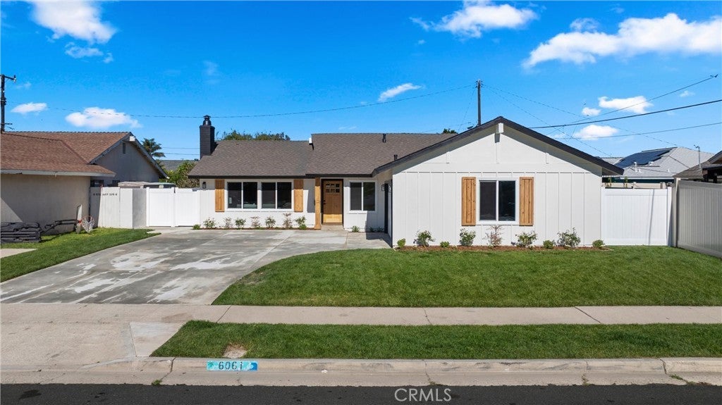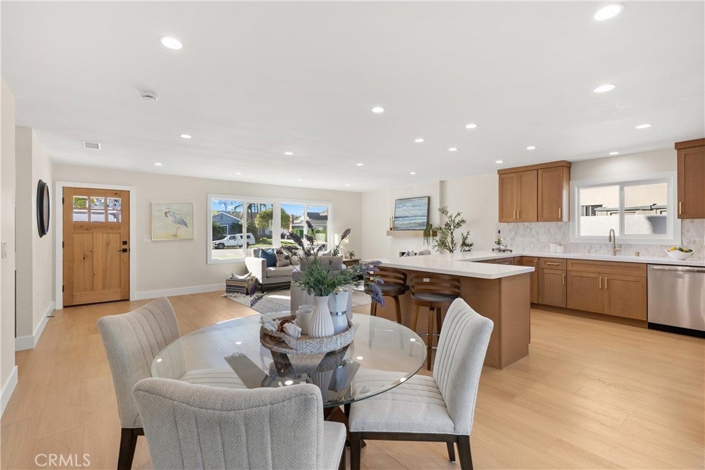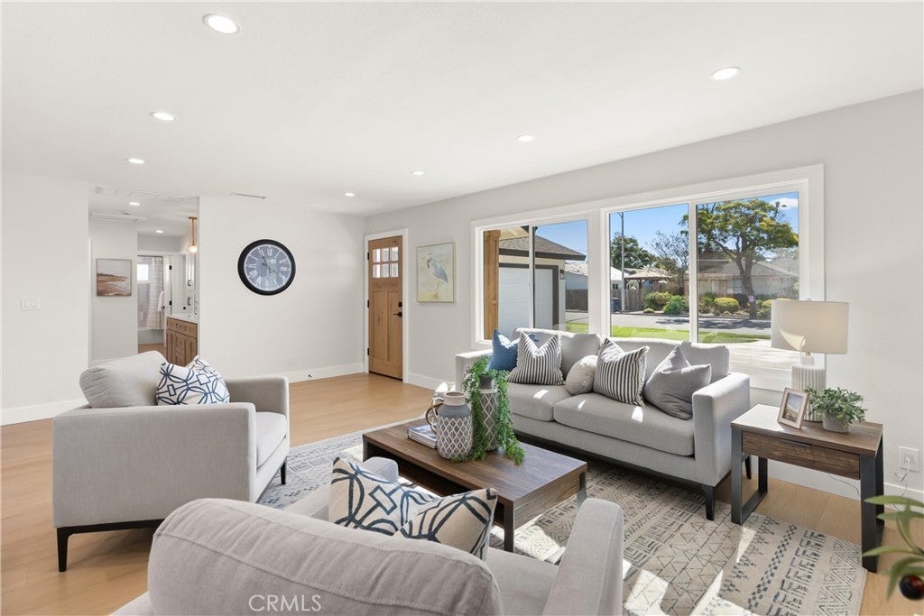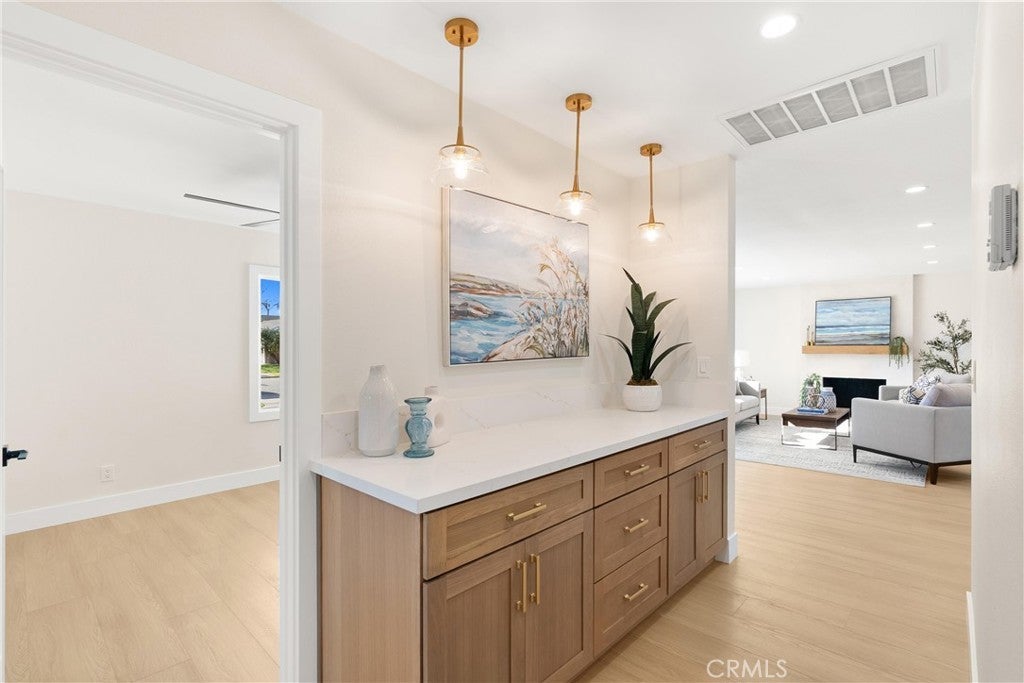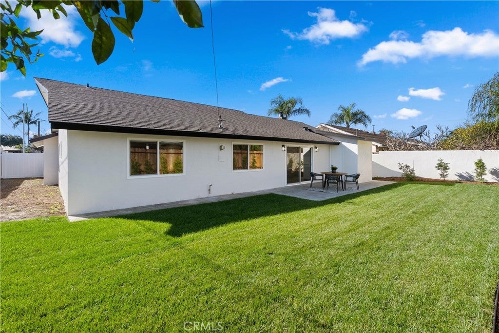 Yes, you can afford coastal luxury in this stunning remodeled beach house and enjoy elevated, effortless living. The walk to the front door pulls you in as you gaze upon the manicured garden flocked with white roses. Classic wood shutters and brand new windows set the tone. The lush green lawn has a timed sprinkler system to keep it picture perfect. Step through the striking wood front door and pause as you take in the breathtaking, redesigned open layout. An elegant fireplace with rich wood mantle anchors the living space while your eye is immediately drawn to the marble backsplash, quartz countertops, and warm wood cabinetry in the kitchen. Stainless-steel appliances shine topped off with a stunning hood with gold accents to complement the designer fixtures. The layout flows seamlessly into a spacious dining area and breakfast bar perfect for relaxed lazy mornings. Tucked discreetly behind the refrigerator, you’ll find a functional laundry and mudroom with direct access to the backyard. So much storage! You’ll be knocked down by the coveted linen cabinet with drawers and cupboards, quartz counters and custom lighting, plus two more storage closets in the hallway as the new furnace is tucked in the attic. The primary suite feels like a true retreat, featuring a generous closet, ceiling fan, and a stunning ensuite bath with a custom tiled shower. The hall bathroom is equally impressive with a soaking tub, custom tile and designer accents. Each bedroom has a ceiling fan and mirrored wardrobes. Out back, enjoy a large patio and expansive grassy yard, perfect for entertaining, playing, or simply soaking in the coastal breeze. Set on a quiet interior cul-de-sac, this home is walking distance to Marina High School and just minutes from the natural beauty of Bolsa Chica Wetlands and the waterfront lifestyle of Huntington Harbor.
