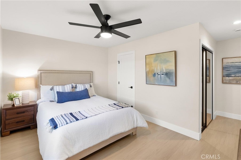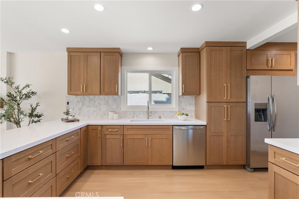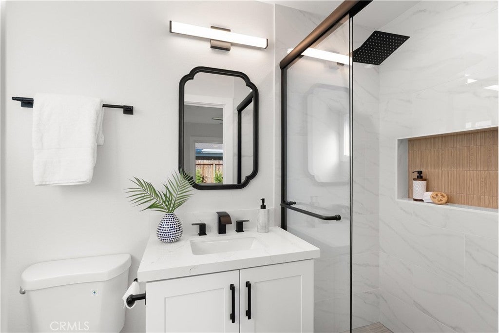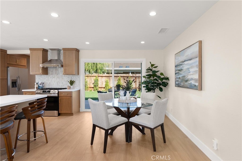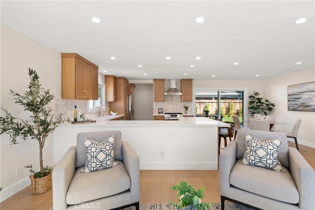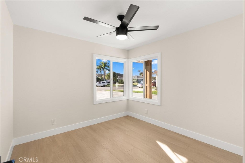 Yes, you can afford coastal luxury in this stunning remodeled beach house and enjoy elevated, effortless living. The walk to the front door pulls you in as you gaze upon the manicured garden flocked with white roses. Classic wood shutters and brand new windows set the tone. The lush green lawn has a timed sprinkler system to keep it picture perfect. Step through the striking wood front door and pause as you take in the breathtaking, redesigned open layout. An elegant fireplace with rich wood mantle anchors the living space while your eye is immediately drawn to the marble backsplash, quartz countertops, and warm wood cabinetry in the kitchen. Stainless-steel appliances shine topped off with a stunning hood with gold accents to complement the designer fixtures. The layout flows seamlessly into a spacious dining area and breakfast bar perfect for relaxed lazy mornings. Tucked discreetly behind the refrigerator, you’ll find a functional laundry and mudroom with direct access to the backyard. So much storage! You’ll be knocked down by the coveted linen cabinet with drawers and cupboards, quartz counters and custom lighting, plus two more storage closets in the hallway as the new furnace is tucked in the attic. The primary suite feels like a true retreat, featuring a generous closet, ceiling fan, and a stunning ensuite bath with a custom tiled shower. The hall bathroom is equally impressive with a soaking tub, custom tile and designer accents. Each bedroom has a ceiling fan and mirrored wardrobes. Out back, enjoy a large patio and expansive grassy yard, perfect for entertaining, playing, or simply soaking in the coastal breeze. Set on a quiet interior cul-de-sac, this home is walking distance to Marina High School and just minutes from the natural beauty of Bolsa Chica Wetlands and the waterfront lifestyle of Huntington Harbor.