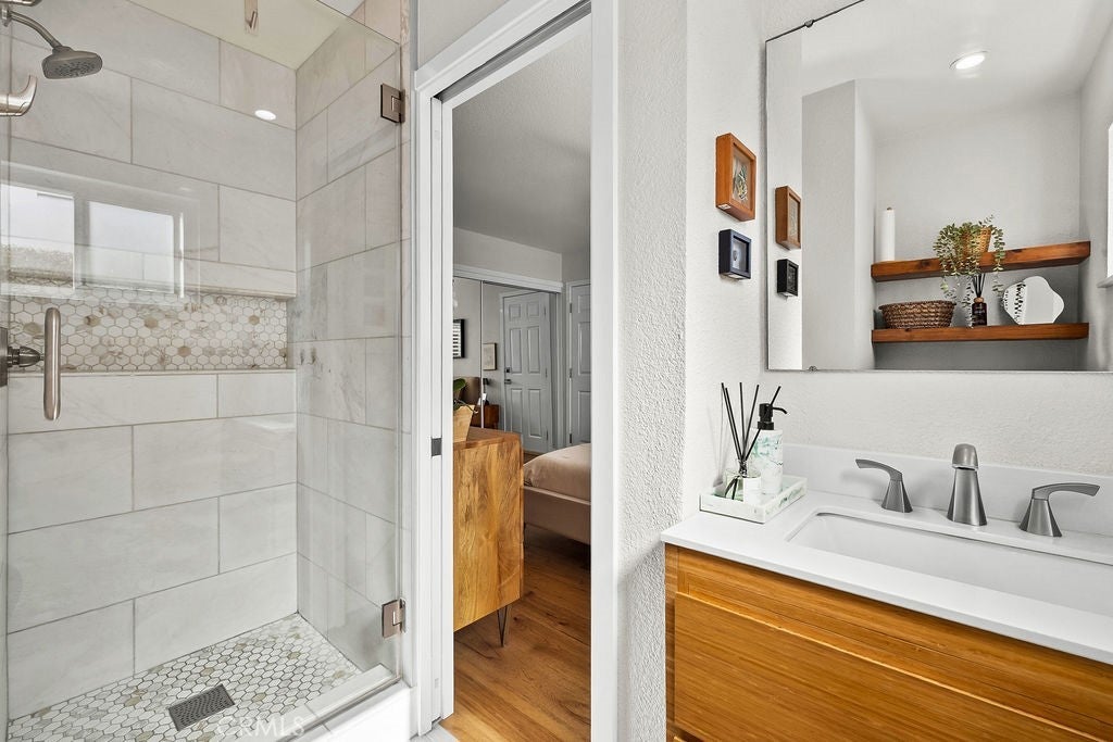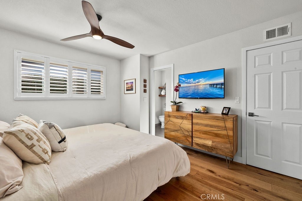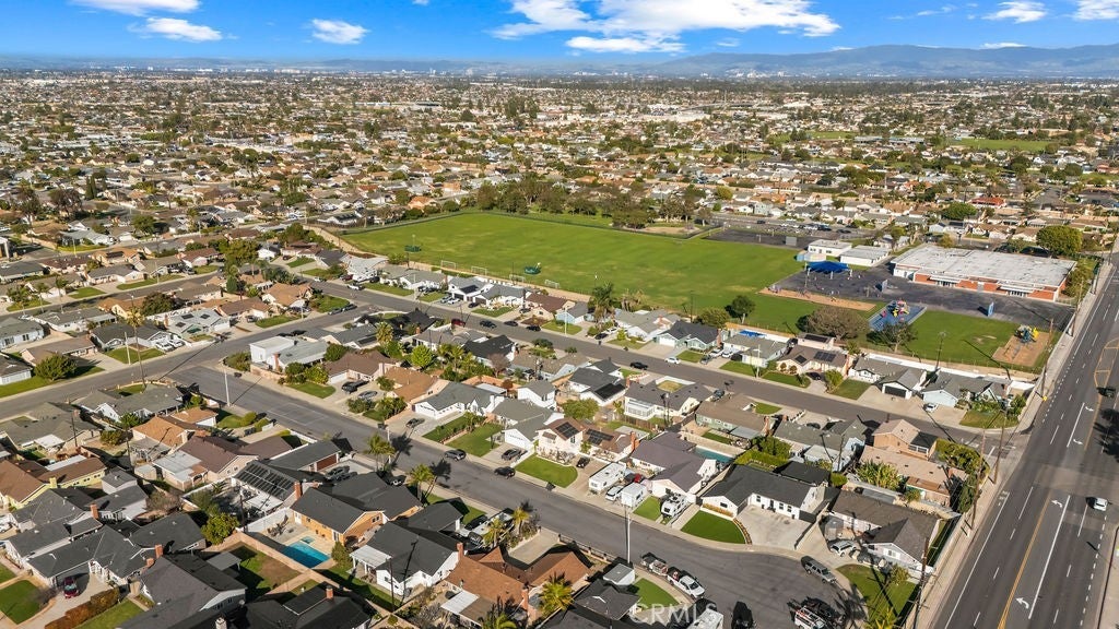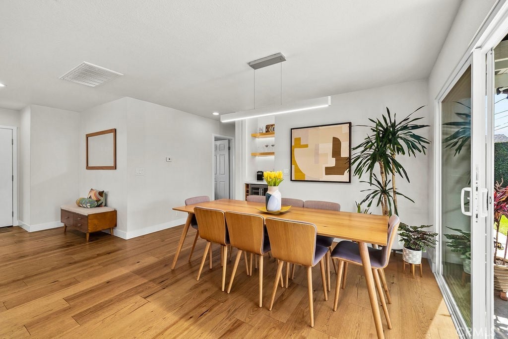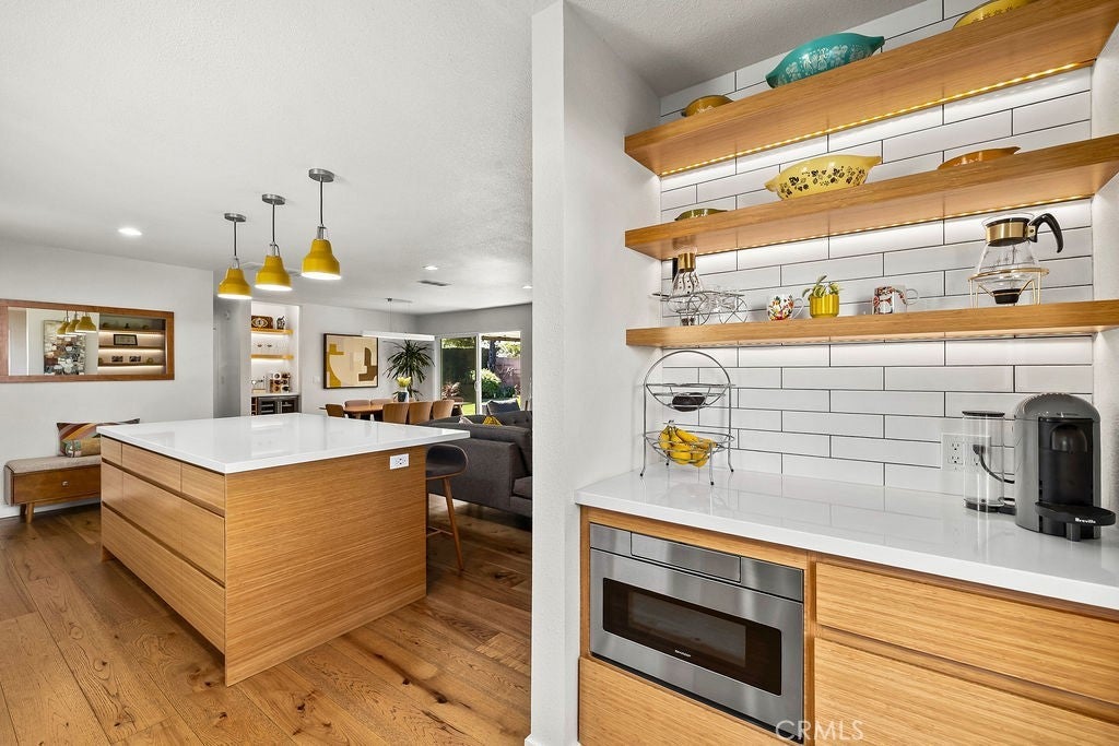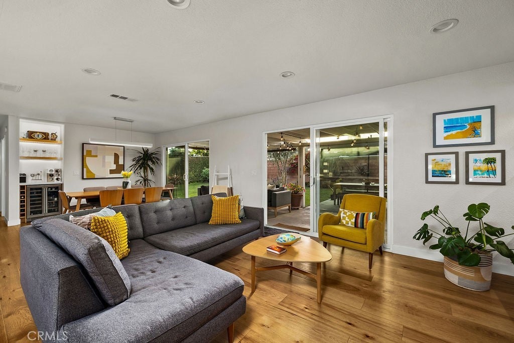 Welcome to this stunning, fully remodeled Huntington Beach home where modern upgrades and coastal charm come together in perfect harmony. Just minutes from the beach, a neighborhood park, and top local schools, this move-in ready gem offers an exceptional blend of comfort, style, and location. Converted from 4 to 3 bedrooms, the open floorplan creates a beautifully inviting space. From the moment you step inside, you'll be impressed by rich Hickory wood plank flooring, custom plantation shutters, and abundant natural light pouring through newer double pane windows and sliders. The living room is a true showpiece, featuring built-in custom bamboo shelving with integrated LED lighting — ideal for displaying your personal style. The gourmet kitchen boasts sleek custom bamboo cabinetry with soft-close drawers, a large island, breakfast bar with a built-in microwave, open shelving, and European white quartz counters throughout. A professional Wolf 6-burner gas range takes center stage, joined by premium stainless-steel appliances including a Bosch dishwasher. Just off the kitchen, a stylish mini bar with quartz countertop, bamboo shelving, and a wine and beer refrigerator makes hosting effortless. Both bathrooms have been completely remodeled with marble tile, bringing a spa-like feel to your daily routine. The spacious primary bedroom includes direct garage access. Major system upgrades include a Presidential TL roof (2017), newer furnace and ductwork, tankless water heater, and rain gutters. New interior and exterior doors, garage door, exterior paint, vinyl gate, and side fence complete the exterior, while fully landscaped front and back yards offer polished, low-maintenance curb appeal. Out back, a covered patio sets the scene for relaxed entertaining, with exterior plug-ins, sunshades, and an enclosed dog run. Smart home features include a Ring camera system and remotely controlled garage door. Washer, dryer, and mounted TV included — truly turnkey. All that's left is to move in and enjoy the Huntington Beach lifestyle!
