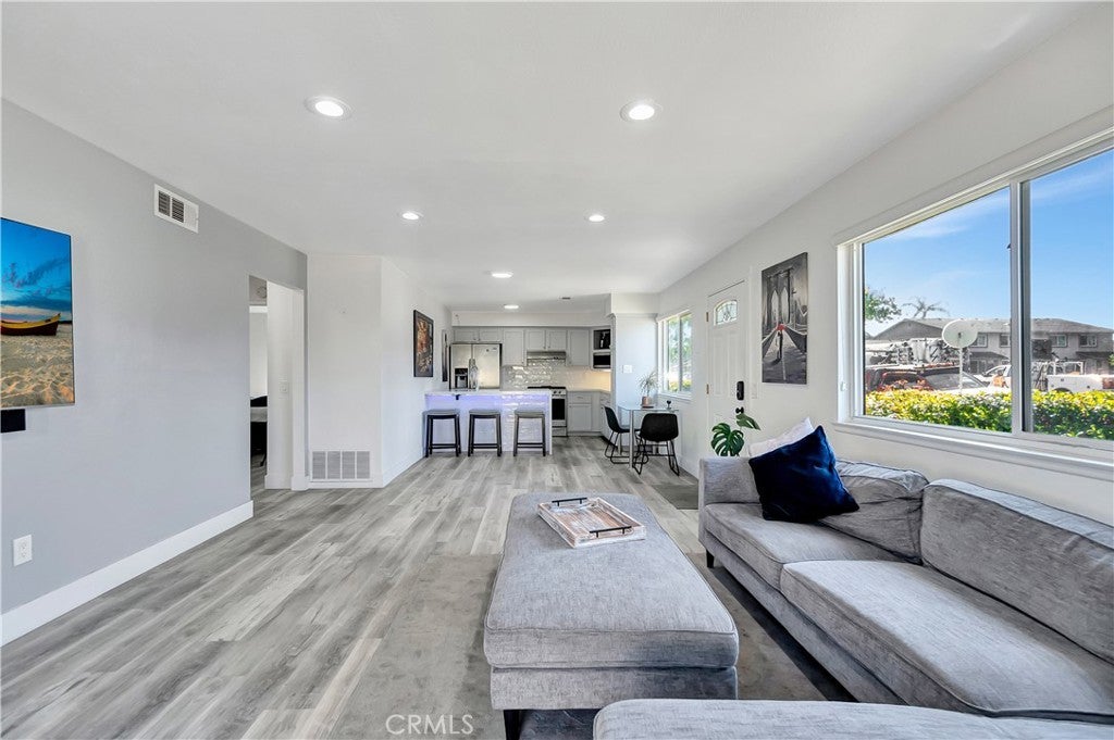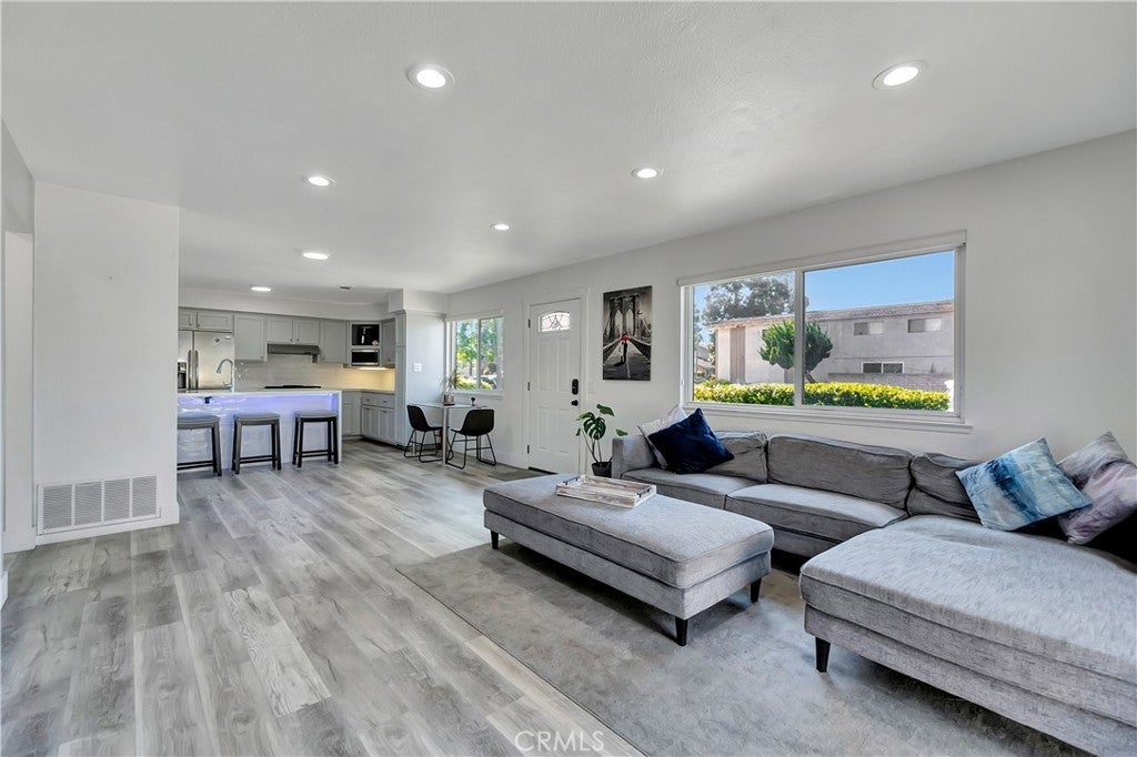 Rare single-story, ground-level unit with no stairs and no one above or below. Located in Harbor Heights Villas, surrounded by landscaped greenbelts and near the community pool and clubhouse. Light-filled open floor plan with updated kitchen featuring refreshed cabinetry and stainless steel appliances, including refrigerator. Kitchen opens to dining area and living room with smooth ceilings and tile flooring. Dual-pane windows and sliding door, recessed lighting with smart switch, Yale smart lock, ceiling fans, and laminate flooring in both bedrooms. One bedroom includes built-in storage bench. Upgraded full bathroom with custom tile tub/shower and updated fixtures. Private patio and indoor laundry inside the unit. Includes one designated parking space and storage in shared two-car garage (half garage per unit). HOA amenities include pool, clubhouse, basketball court, RV parking, water and trash. Close to Huntington Harbor, beaches, shopping, dining, and approximately 1.3 miles to Bolsa Chica Wetlands.