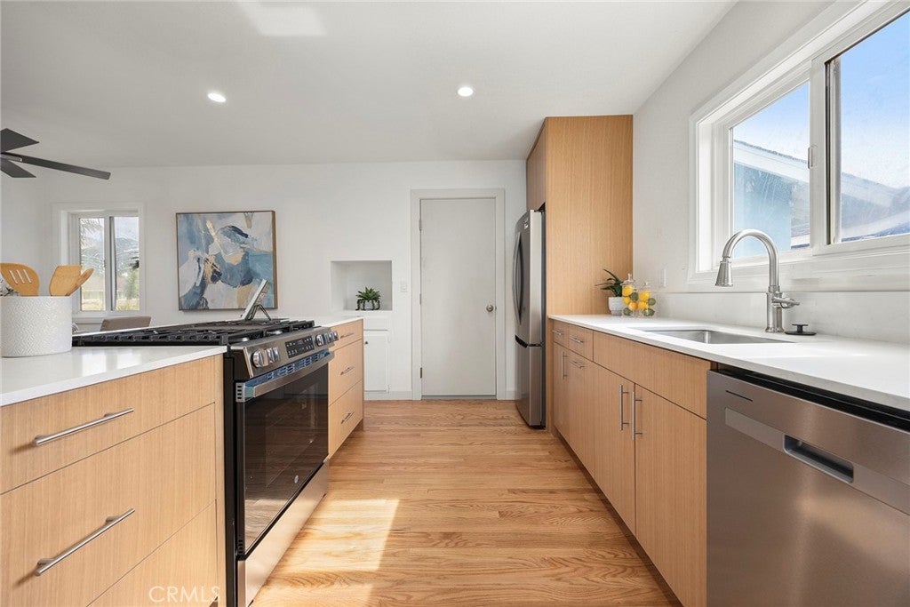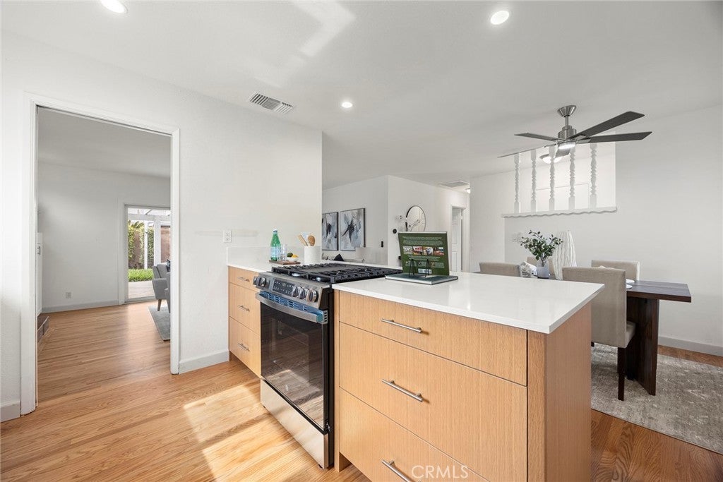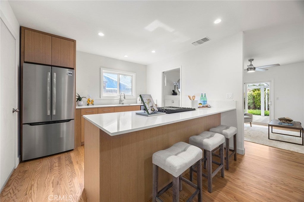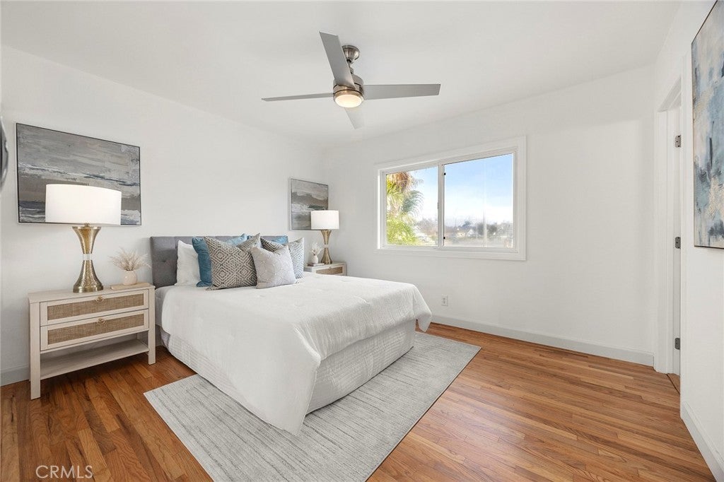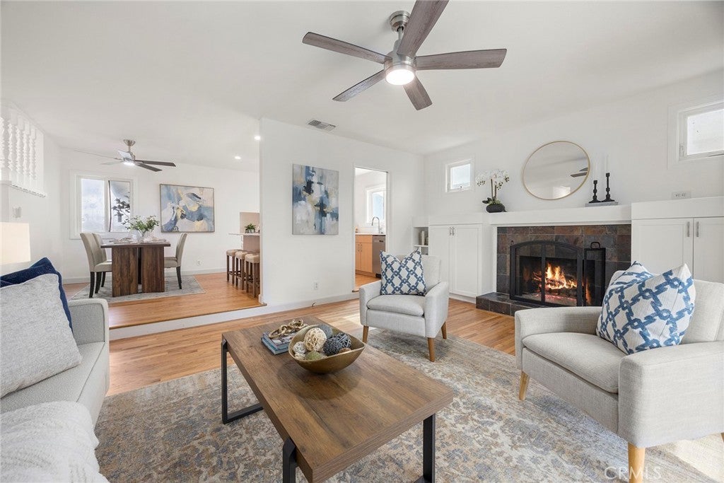 Recently renovated and move-in ready, this beautifully updated 3-bedroom, 2-bathroom single-level home offers 1,137 sqft of living space on a generous 6,200 sqft lot in desirable Huntington Beach—just a 15 minute drive to the beach! From the moment you arrive, you’ll appreciate the expansive front lawn and inviting curb appeal. Step inside to find beautifully refinished original hardwood flooring that flows throughout the entire home, including all bedrooms, creating warmth and continuity. The brand-new kitchen is a true highlight, featuring stunning quartz countertops, a convenient breakfast bar, recessed lighting, and new stainless steel appliances. New baseboards throughout the home add a crisp, modern touch. The dining area, living room and primary bedroom all feature ceiling fans for added comfort. Step down into the spacious living room where you’ll find built-in cabinetry and an inviting fireplace—perfect for relaxing evenings. A sliding glass door opens to the large backyard, complete with a patio cover and plenty of space with endless possibilities for outdoor entertaining, gardening, or future customization. The primary suite includes an ensuite bathroom with a walk-in shower and tile enclosure. Two additional bedrooms and a full bathroom complete the well-designed floor plan. Conveniently located near three elementary schools, Marina High School, Glen View Park, and a variety of local amenities including shopping and dining. With the beach just minutes away, this home offers the ideal blend of comfort, convenience, and coastal living. Don’t miss this opportunity—schedule your showing today!